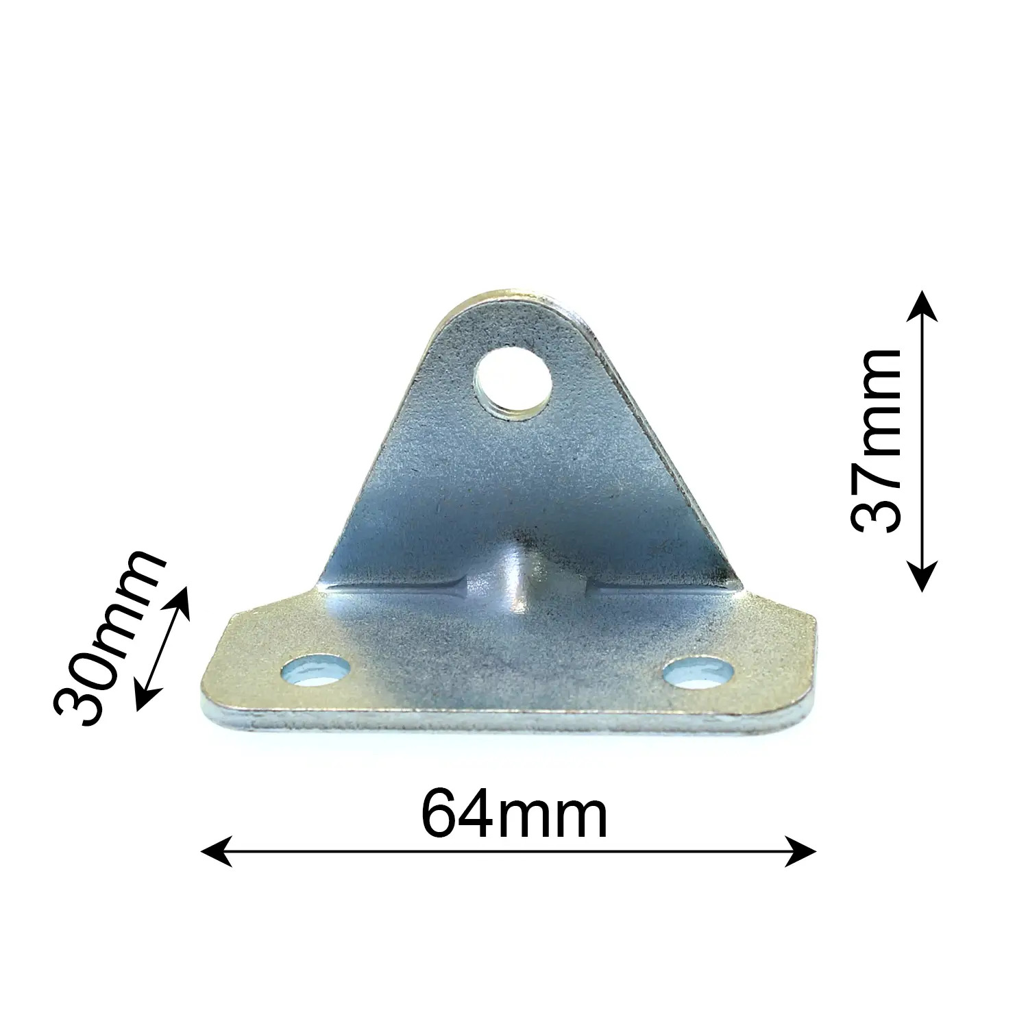 Gas strut bracket with 2 hole fixing points. 3mm thick. Zinc plated.