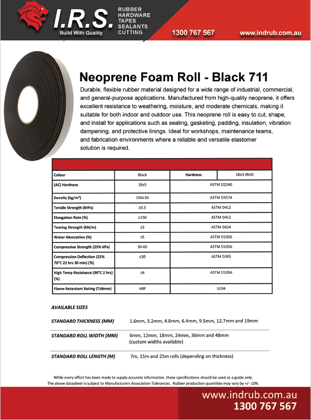 Neoprene Foam Roll - Black | is a durable, flexible rubber material designed for a wide range of industrial, commercial, and general-purpose applications. Manufactured from high-quality neoprene, it offers excellent resistance to weathering, moisture, and moderate chemicals, making it suitable for both indoor and outdoor use.